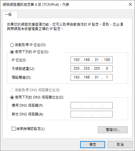Uboot 中不含 DHCP 功能,因此需將電腦網路卡設定為固定 ip 。